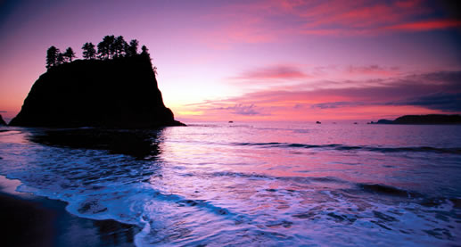 Second Beach, just east of La Push, is popular with photographers and is reached by way of a .6 mile forested trail that leads to a 2 mile long sandy stretch of beach with sea stacks and tidal pools.
